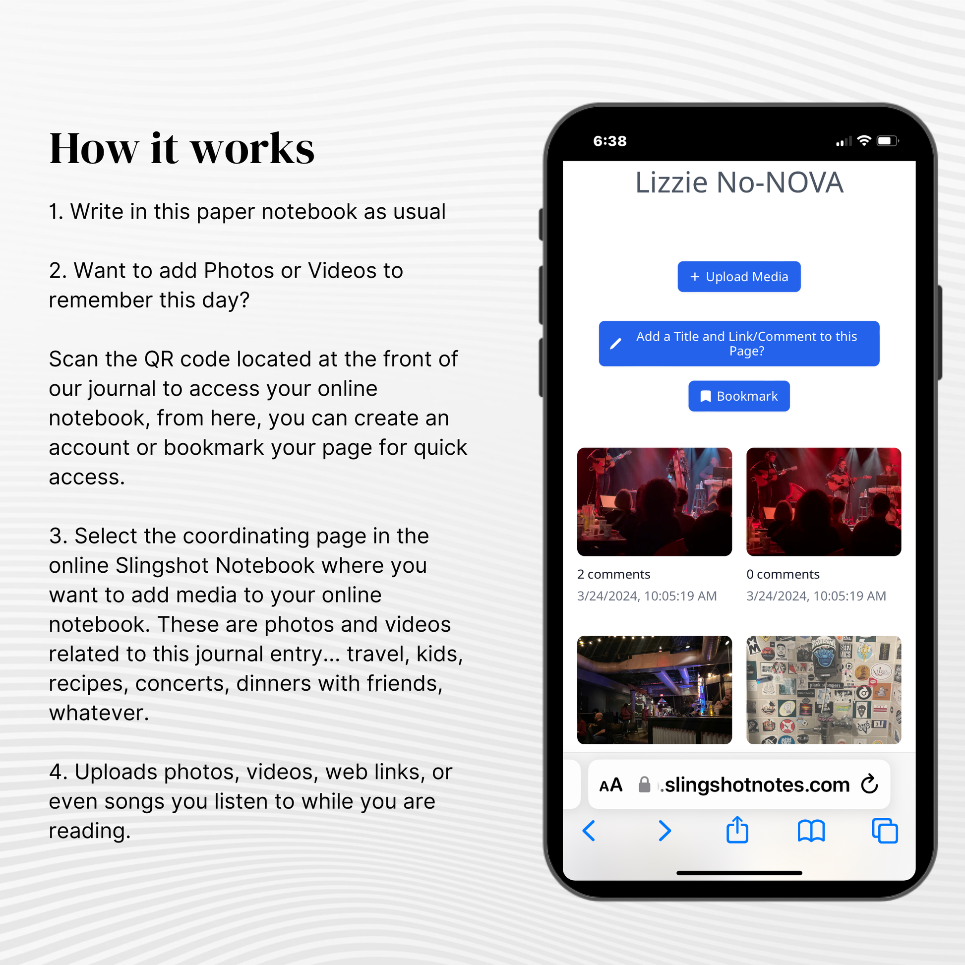Add photos, videos, and more to each entry to save and recall special moments.